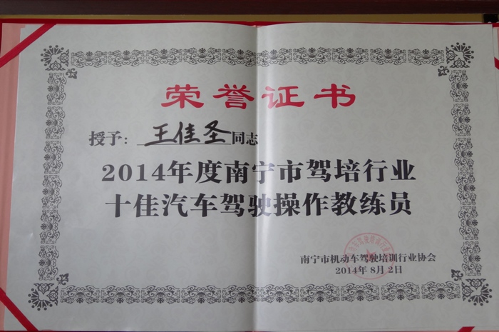 王佳聖榮獲“十佳汽車(chē)駕駛操作教練員”證(zhèng)書