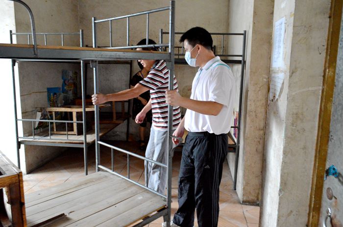 學院譚勁濤院長助理與黨(dǎng)員教師整理學生宿舍床架