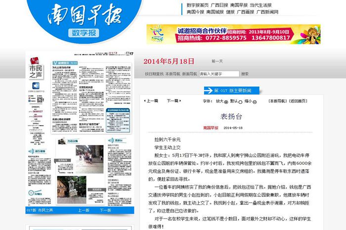 《南(nán)國早報》對趙祥龍拾金不昧的舉動進(jìn)行了報道