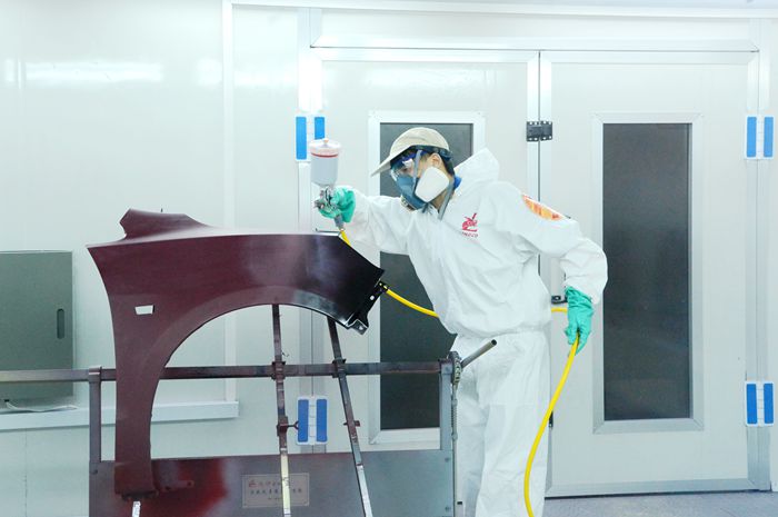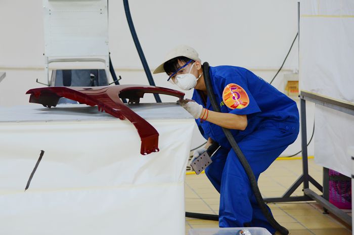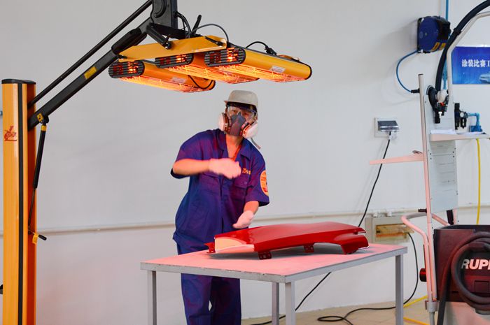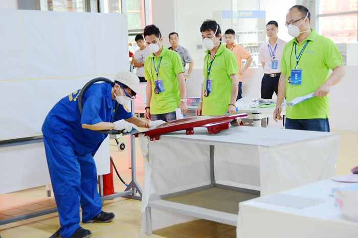 我院選手林劍波進行汽車塗裝競賽子項目——麵(miàn)漆噴(pēn)塗