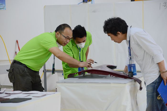 我院選手林劍波進行汽車塗裝競賽子項目——損傷處理