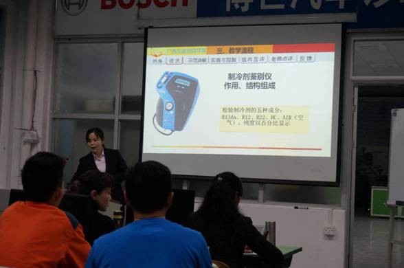 327,我院汽車工程係兩位專職教師李(lǐ)霞(xiá)和唐(táng)李珍在廣州市交通技師學院(yuàn)為 “博世技師班”的核心教師們展(zhǎn)示汽車空調模塊(kuài)教學任務“理實一體化”教學(xué)示範課。