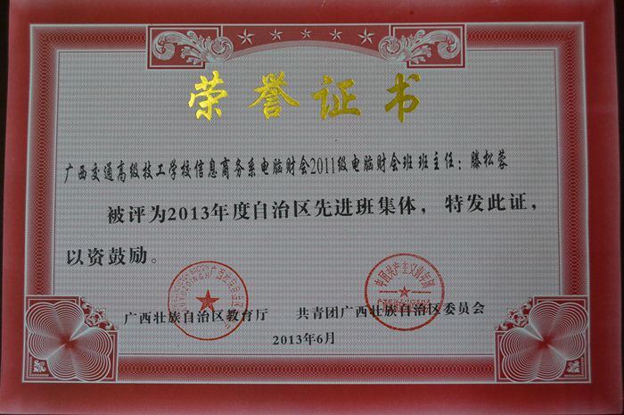 2011級電腦財會班獲得了2013年度自治區先進集體