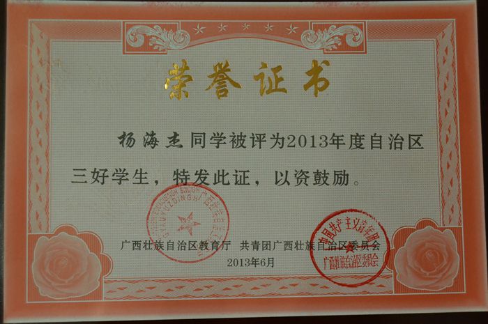 楊海傑同學被評為2013年度自治區三好學生