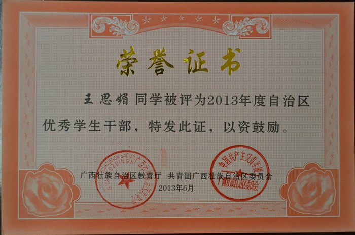 王思媚同學被評為2013年度自治區優秀學生幹部