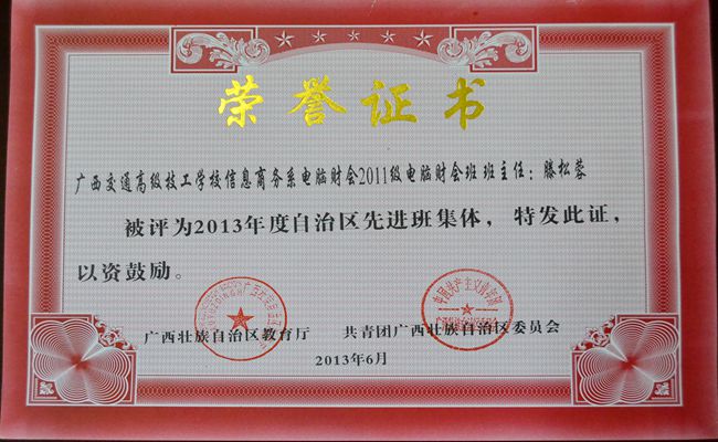 2011級電腦財會班被評為2013年度自治區先(xiān)進班集(jí)體