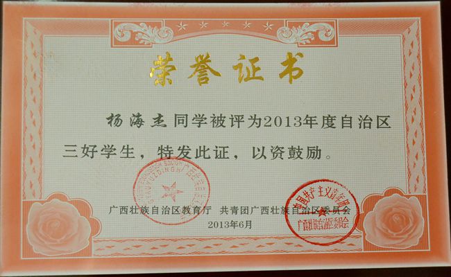 楊海傑同學被評為2013年(nián)度自治區三好學生(shēng)