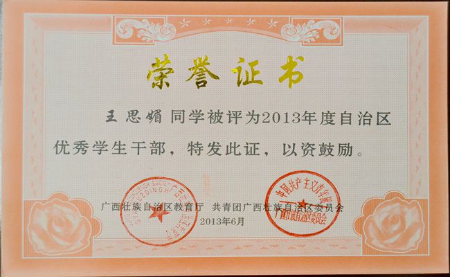王思媚同學被評為(wéi)2013年度自治(zhì)區優(yōu)秀學(xué)生幹(gàn)部