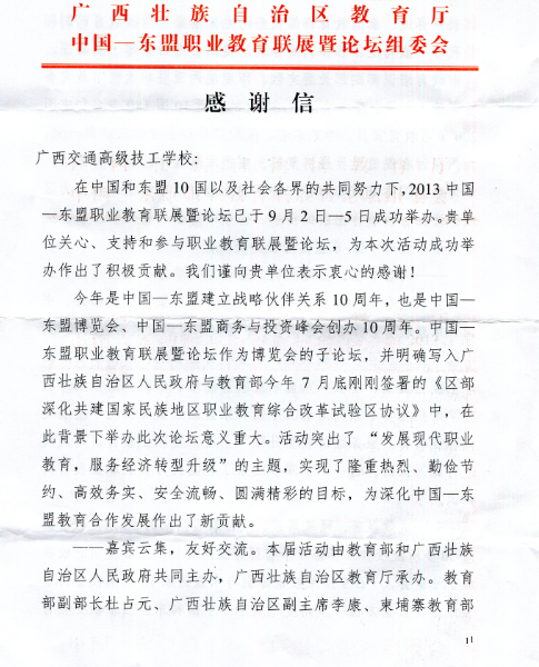 自治區教育廳與中國—東(dōng)盟職業教育聯展暨論壇組委會向我院致謝