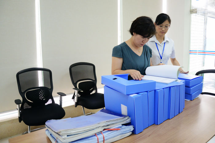 廣西物資學(xué)校副校(xiào)長、檢查小組組員莫海燕仔細檢查項目建(jiàn)設相關材料
