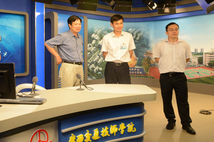 學院韋紅教院長陪同(tóng)自治區人社廳職業能力建設處覃(tán)朝俊副(fù)處長、陳振成主任參觀我院(yuàn)演播廳(tīng)