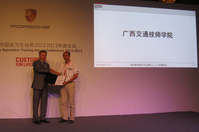 保時捷(中國)實(shí)習生培養2012-2013年度會議於(yú)2013828-29日在中國古城西安萬達希爾頓酒店隆重舉行。參加會議的(de)有保時捷(中國)培訓(xùn)學院高(gāo)級經理費傑先生、保時(shí)捷(中國)服務培訓經理吳珂先生、保時捷(中(zhōng)國)學徒項目專員李衡先生,全國(guó)保時捷校企合作院校領導代表及來自全國各地43家保時捷中心的經理等100多人。會議由保時捷(中國)服務培(péi)訓經理吳珂先生主持。此次會(huì)議的主要內容是總結過去一年來保時捷(中國)校企合作項目所取得的成績和經驗,並簡要介紹了該項目2014年度工作計劃(huá)。