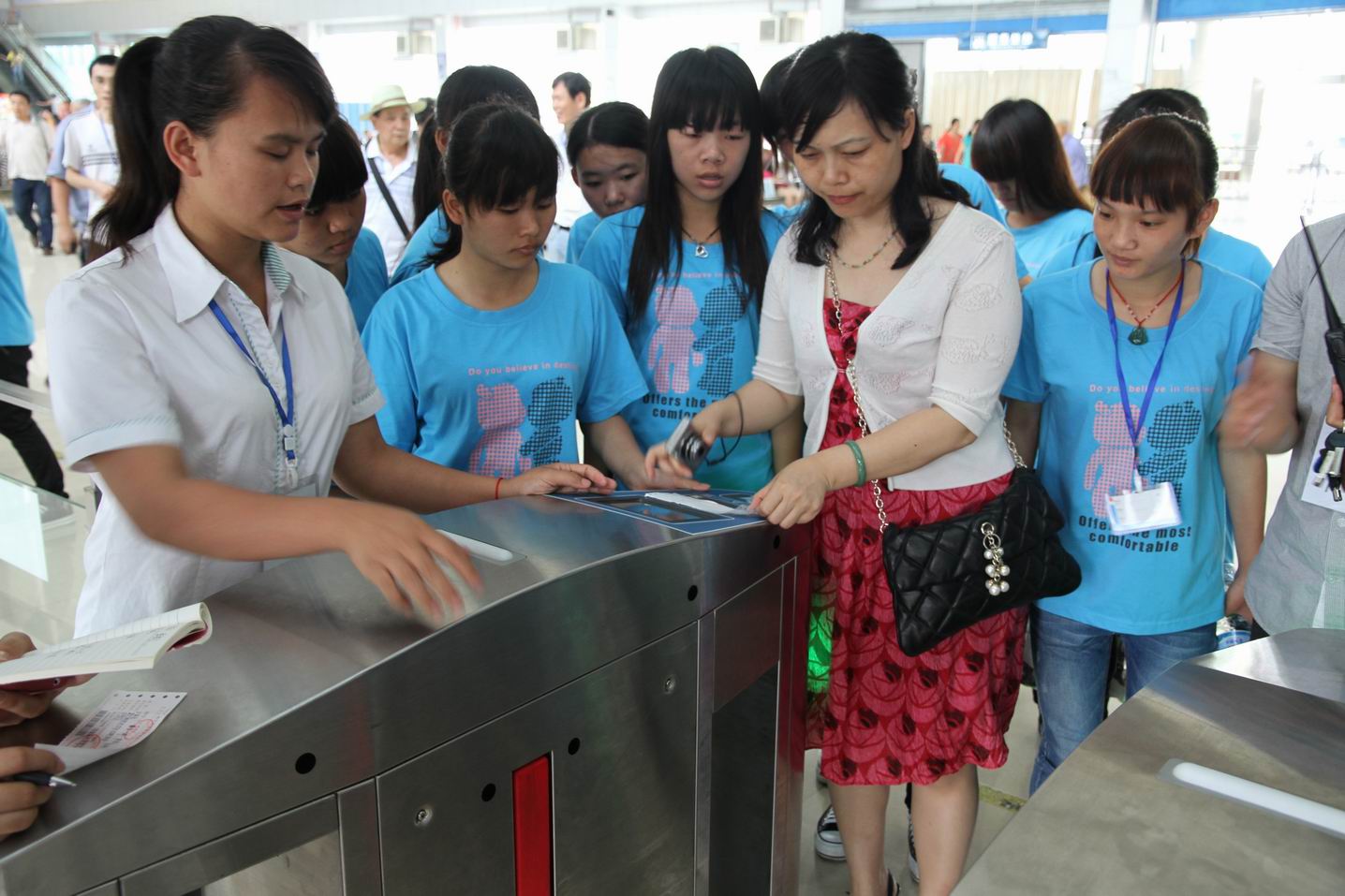 參觀過程中,我院師生親身體(tǐ)驗了“智(zhì)能化”的購票、檢(jiǎn)票、存包等過程。該站自助購票區有12台自助(zhù)售票機,乘客可以通過現金或銀聯卡兩種支付方式購票(piào),購票時(shí)間僅需10秒鍾。該站檢票口,安裝有26台電子(zǐ)閘機,能實現三種檢票方式:購買(mǎi)電子車票的乘客,可以通過刷身份證或電子車票上的二維(wéi)碼(mǎ)檢票進站;持紙質車票的(de)乘客,可以通過刷車票上的條碼完成檢票。