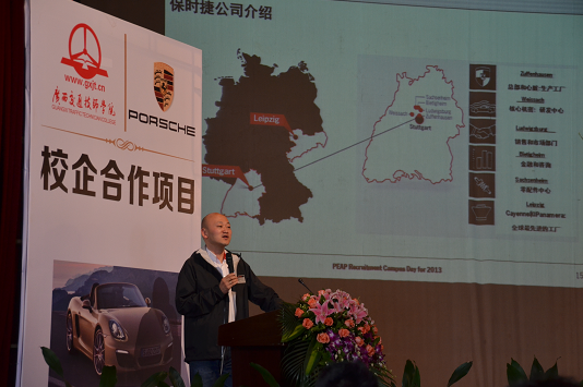 保時捷是世界知名汽車(chē)品牌,從2010年進入中國,目前在中國已擁有50多家4S店。此次招募動員會是我(wǒ)院與保時捷開展校企合作項目的重要一步。我校與保時捷(中國)公司從去年11月(yuè)初開始接觸,並達成初(chū)步合作意向(xiàng)。目前,我院兩位老師已通過(guò)保時捷(jié)(中國)公司考試選拔,將到(dào)保(bǎo)時(shí)捷(jié)培訓中心進行為期一年的培訓。