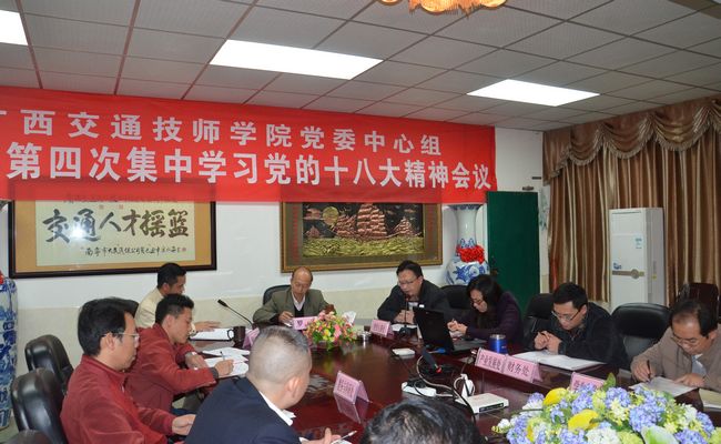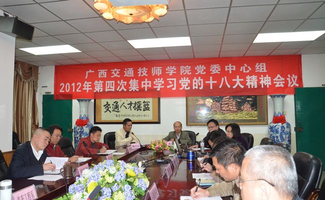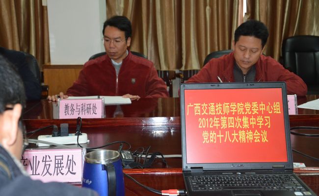 11月30日下午,我院黨委中(zhōng)心組2012年第四次集中學習黨的十八大(dà)精神會議在辦公樓二樓會議室召開。會議深入學習了胡錦濤同誌在十八大(dà)會議上所作的(de)報(bào)告,並提出學習(xí)貫徹(chè)意見。全體中層以上領導幹部,以及各黨支部書記、團委書記均按時參加了會議。會議(yì)由學(xué)院黨(dǎng)委委(wěi)員、副院長陸天雲同誌主持。黨委書記(jì)羅華同(tóng)誌在會議上做了重要學習講(jiǎng)話。