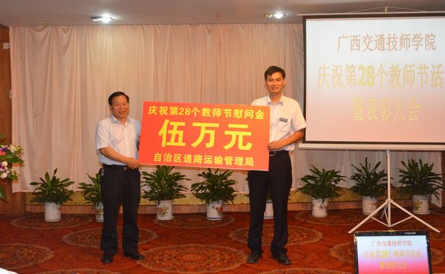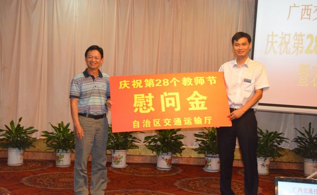 圖(tú)七:自治區交通運輸廳黨組成員、總工程師王劼耘代表自治區交通運輸廳給學院送上(shàng)慰問金。