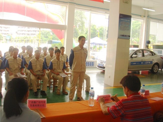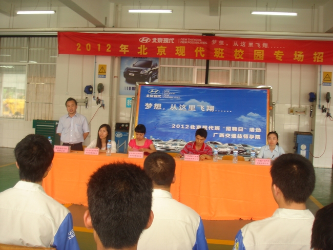 2012年6月6日(rì),北京現代桂林順景特約銷售服務店、廣西通源汽車銷售服務有(yǒu)限公司、廣西(xī)鑫廣(guǎng)達汽車貿易有限公司、北京現代玉林得利(lì)特約銷售服務店和梧州金欣(xīn)汽車有限公司(sī)等(děng)5家北(běi)京現(xiàn)代(dài)汽(qì)車(chē)品牌的公(gōng)司在我校召開專場招聘會,麵試招聘我校2013屆畢業頂崗實習生。