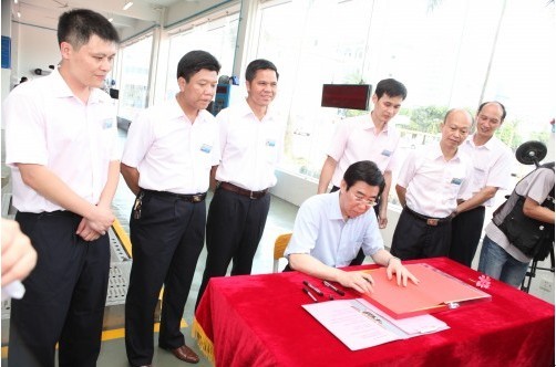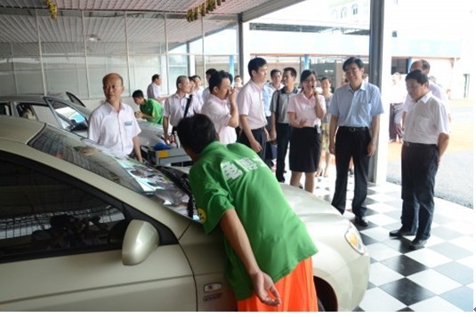 王曉初副部長一行抵達學校後,與學校領(lǐng)導(dǎo)班子親切握(wò)手,並(bìng)與(yǔ)學(xué)校中層以上(shàng)幹部合影留念。接著,在宣傳(chuán)展版前聽取了學校關(guān)於(yú)基本(běn)校情、伊嶺(lǐng)新校區規劃建設、教學改革成果、招生就(jiù)業、校企合作、職業培訓(xùn)、學生管理等方麵的情況(kuàng)匯報。隨(suí)後,在學校校長(zhǎng)韋紅教(jiāo)、黨委書記羅華的陪(péi)同下,王曉初副部(bù)長(zhǎng)一行實地考察了學校校區、汽車鈑金與塗裝(北(běi)京史賓尼斯)實訓中心、汽(qì)車美容(róng)裝飾(龜博士)實訓中心、汽車營銷(北京運華天地)實訓中心、廣西高速公(gōng)路收費員(廣(guǎng)西交投)培訓基地(dì)、汽車電氣(美國SPX公(gōng)司)實訓中心、汽車故障診斷(上海景格)模擬仿真中心、汽車檢(jiǎn)測與維修(北京現代)實訓中心、機動車駕駛員(yuán)培訓中心等教學實訓場所。