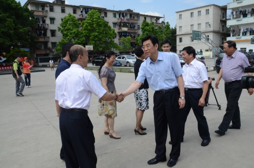 圖七(qī):人力資源和社會保障部王曉初副部長(右一)對學校韋紅教校長(左二)、