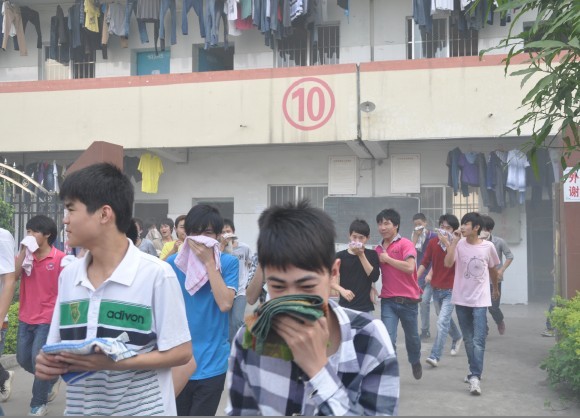 伴(bàn)隨著警笛的呼嘯(xiào)聲,演習正式開始。學生宿舍樓被“濃煙”籠罩,約三千名學生按照(zhào)預先講解的疏散路線,緊急行動起來。老師們以最快的速度趕到(dào)各個宿舍樓,迅速組織學(xué)生口捂濕毛巾,蹲身(shēn)弓腰紛紛從樓梯向指定的安全聚集點疏散。學(xué)校護校(xiào)隊的隊員們也立即來到樓梯和(hé)安全出口等人員疏散(sàn)集中地點,協助(zhù)引導學(xué)生(shēng)疏散。從警(jǐng)報(bào)響起到全體師生疏散到安全點,並確認人數無誤,總用時約8分鍾。