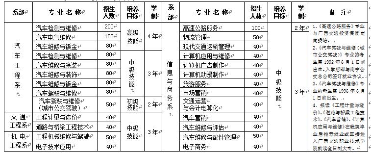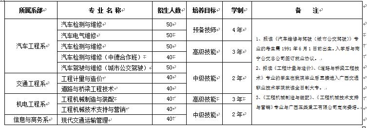 我院隸屬於自治區交通運輸廳。學校毗鄰風光秀麗的南寧獅山(shān)公園,是一所公辦(bàn)國家(jiā)重(chóng)點技(jì)工院校,以培(péi)養中級、高級技能人才為主(zhǔ),集遠程學曆教育、汽車駕駛培訓、職業技(jì)能(néng)培訓與(yǔ)鑒定為一體的交通行業綜合(hé)性職業教(jiāo)育培訓基地。學(xué)校設有汽車工(gōng)程係、交(jiāo)通工(gōng)程係、機電工程係、信息與商務係(xì)四個(gè)係部,在校生6000多人,專任教師300多人。近年來,學校學生參加全(quán)國、全區各類技(jì)能競賽榮獲一等獎獎項達到110多項(xiàng),就業率達99%以上。33年的辦學曆史,積蓄了深(shēn)厚的文化底蘊,先後獲(huò)得“自治區職業教育先進單(dān)位”、“廣西優秀技(jì)能人才培育突出貢獻獎”、“自治區文明(míng)單位”、“全(quán)國十佳最受物流企業歡迎的學校(xiào)”等榮(róng)譽稱號。2012年我校麵向全區招收初中、高中、中(zhōng)職應曆屆畢業生。