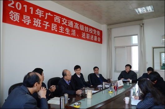 12 月 26 日上午(wǔ),學校黨委在(zài)辦公樓6樓會議(yì)室(shì)召開黨(dǎng)委領導班子2011年度民主生活、述(shù)職述廉(lián)會。自治區道路運輸管理局黨委辦公(gōng)室主任王愛君、人事科科長鍾邱蒞臨(lín)指(zhǐ)導。
