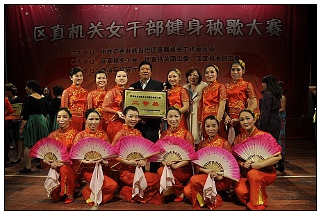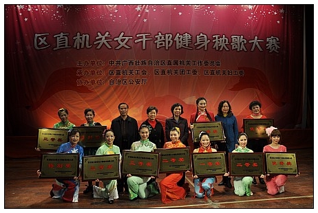 圖(tú)五:區直機關女(nǚ)幹部健(jiàn)身秧歌大賽(sài)頒獎典禮。我校代表自治區交通運輸廳在大賽中榮獲二等獎,前排左四為我校劉飛英老師。