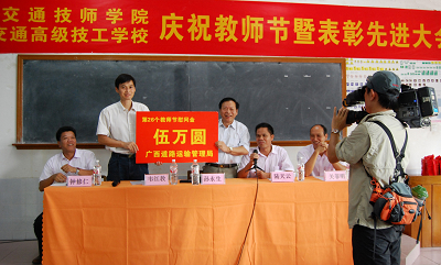圖三:韋紅教校長從孫永生書記手上接過自治區(qū)道(dào)路運輸管理局送來的5萬元節日慰問金(jīn)