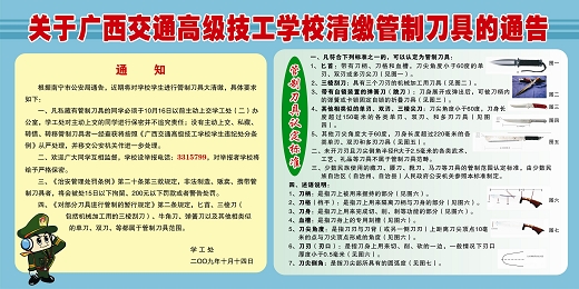 近日(rì),學工處聯合公安機關在校內開展管製刀具清繳工作,未發現有私藏管製刀具行(háng)為。通過開(kāi)展管製刀(dāo)具清繳(jiǎo)活動,增強了廣大學生(shēng)的法製觀念,提高(gāo)了學生自我防範意識,確保校園(yuán)穩定、安全、和諧。